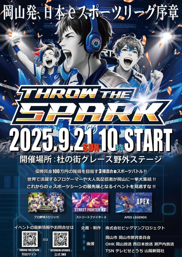 2025年9月20日と21日、岡山市杜の街グレースにおいて、リーグ制大会『Throw the SPARK-火花を散らす-』が開催されました。この大会では、プロスピ、APEX、ストリートファイター6の3ジャンルにおいて、6名のeスポーツインフルエンサーたちが真剣勝負を繰り広げ、ナンバーワンの称号と優勝賞金100万円をめぐって争います。また会場内には飲食ブースや、新作ゲームコーナー、さらにはオリジナルグッズコーナーなど一日楽しめるようになっています。